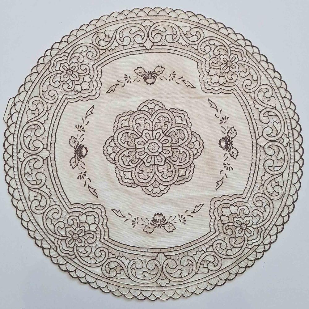 Ürün çapı 40 cm’dir. Pvc yapıda olup, Dantel görünümdedir. Bej rengi üzerine kahve rengi işlemedir. Ürün Japon teknolojisine sahiptir. Koku yapmaz. Zeminde kayma yapmaz. Runner, sehpa üstü, supla, servis altlığı, tepsi içi çok amaçlı kullanılabilir. Şık bir kullanıma sahiptir.